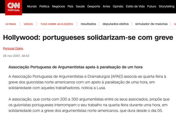 “A Associação Portuguesa de Argumentistas e Dramaturgos (APAD) associa-se quarta-feira à greve dos guionistas norte-americanos com um apelo à paralisação de uma hora, em solidariedade com aqueles trabalhadores, noticia a Lusa.”