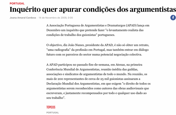 “A Associação Portuguesa de Argumentistas e Dramaturgos (APAD) lança em Dezembro um inquérito que pretende fazer “o levantamento realista das condições de trabalho dos guionistas” portugueses, para tentar apurar “os valores práticos, os direitos reais conseguidos” pelos argumentistas que trabalham em Portugal, diz João Nunes, presidente da APAD.”