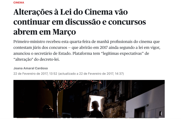 “O presidente da Associação Portuguesa de Argumentistas e Dramaturgos (APAD), João Nunes […] sugeriu, que o audiovisual e o cinema fossem considerados indústrias produtoras de bens imateriais exportáveis e beneficiassem do plano, tal como os produtores de bens materiais.”