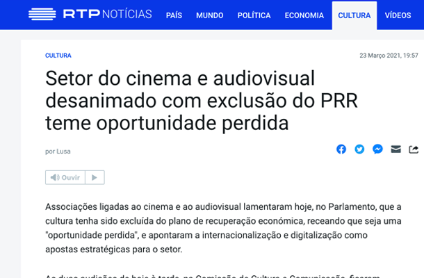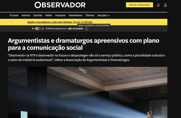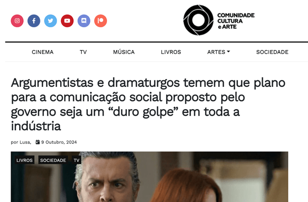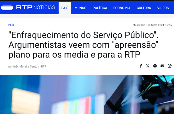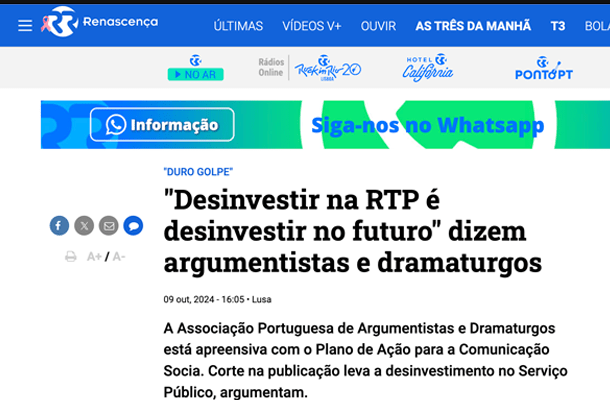 “Argumentistas e dramaturgos apreensivos com plano para a comunicação social “Desinvestir na RTP é desinvestir no futuro e desproteger não só o serviço público, como a pluralidade cultural e o setor da indústria audiovisual”, refere a Associação de Argumentistas e Dramaturgos.”