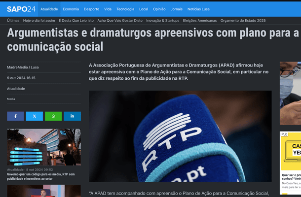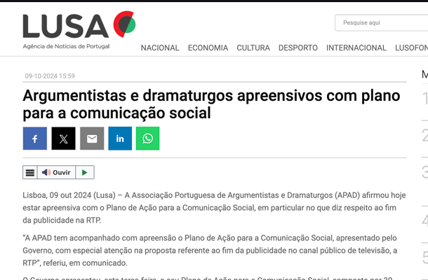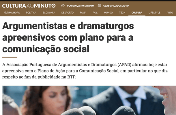 “Um dia depois de o Governo ter apresentado o que denominou de Plano de Ação para a Comunicação Social, a Associação Portuguesa de Argumentistas e Dramaturgos (APAD) afirmou estar a acompanhar “com apreensão” as medidas contempladas neste documento, em especial a referente ao fim da publicidade na RTP. “