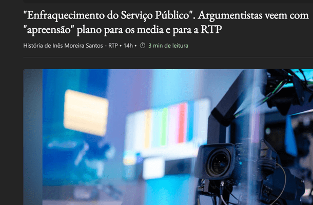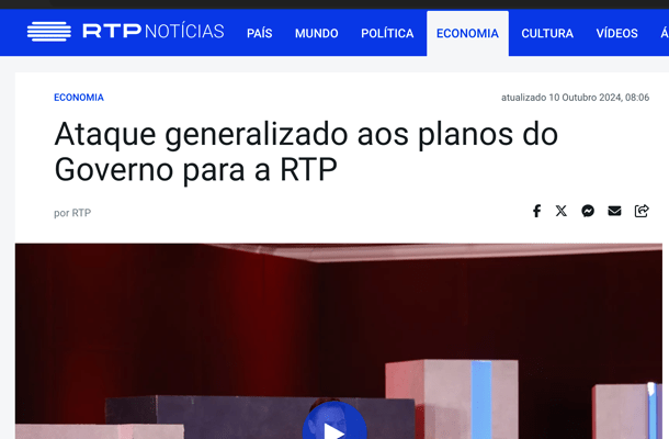 “Ataque generalizado aos planos do Governo para a RTP. Desde o sindicato dos jornalistas à associação de argumentistas, fora do Governo poucos parecem compreender o plano apresentado para a RTP. O executivo diz que o objetivo é fortalecer a televisão e rádio públicas, mas há quem entenda este plano apenas como um desinvestimento.”